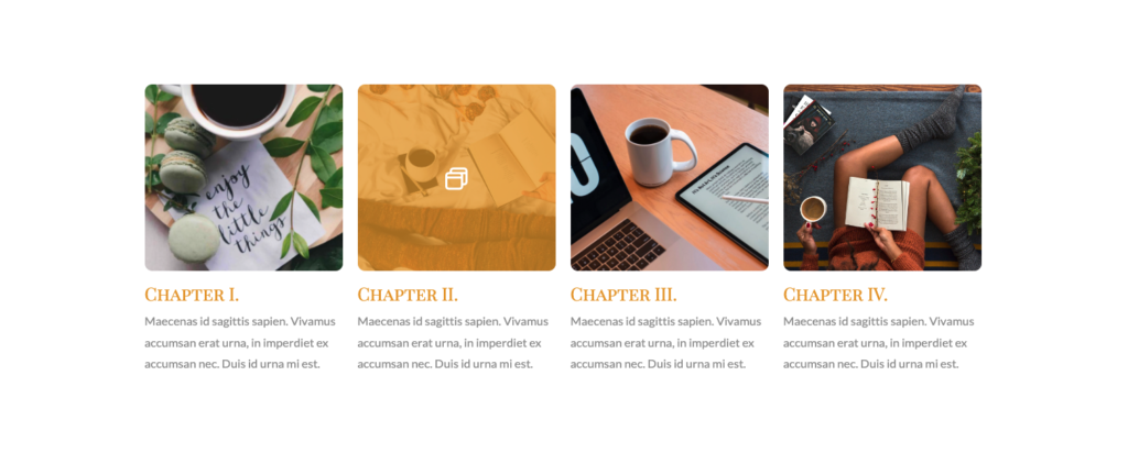 This widget adds an image box with a lightbox (opens when the image is clicked), where you can add your sample chapter overview contents.