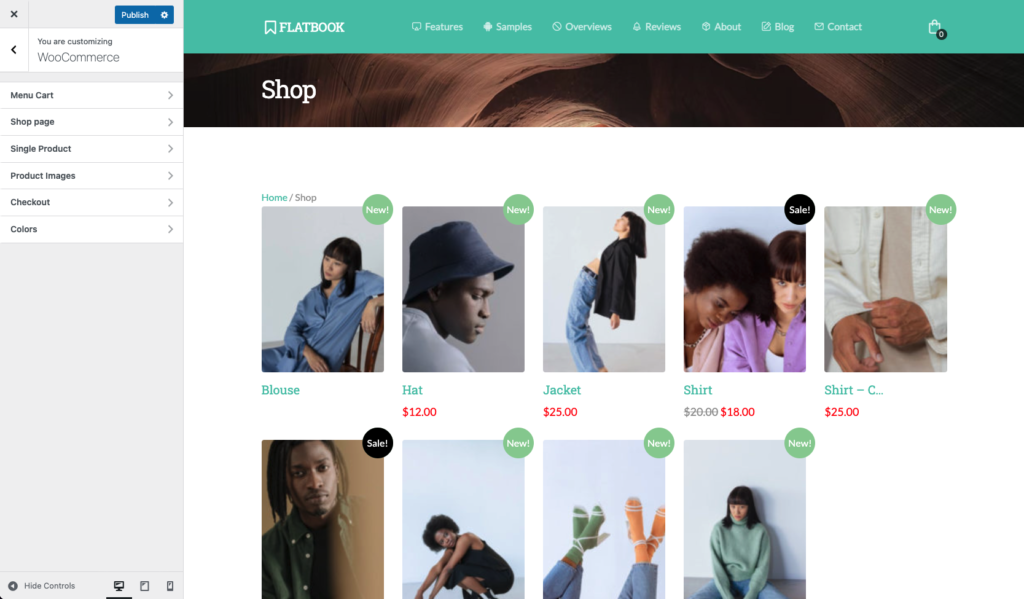 This panel of the Customizer contains the WooCommerce shop settings of the site. If you don’t see this panel, then go to Dashboard > Plugins > WooCommerce and activate it.